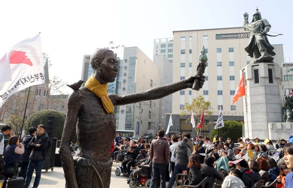 釜山東区草梁洞の鄭撥将軍の銅像の前に登場した「強制徴用労働者像」(2019年3月1日撮影、写真:YONHAP NEWS/アフロ)