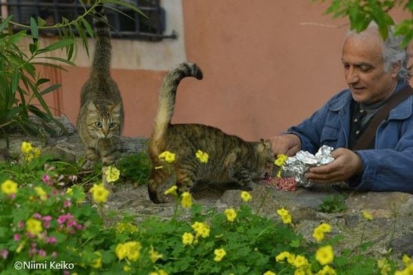 ようやくおじさんが出てきました。あげているのは挽き肉。「猫たちには栄養をとってほしいからね」と話していました。おじさんの飼い猫ではなく、この地に住み着いた地域猫で、近所の数人で世話をしているそうです。