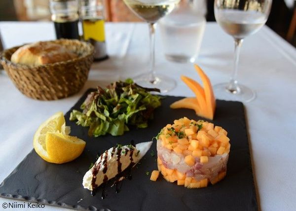 注文したのは「鮮魚のタルタル、メロンとともに」。想像したのとはだいぶ違ったものが出てきました。中央手前に盛られているのは、生クリームのタルタルソース。「なんだこれは!」っていうくらい美味しかったです。