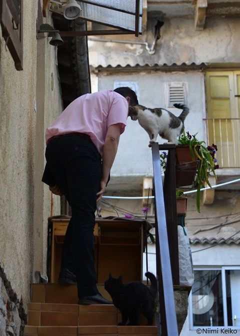 コルテは高低差のある町です。坂道を上ったり下りたりする道すがら、ひょっこりと猫と出会います。「あらぁ、素敵な猫ちゃん」と声をかければ、まんざらでもない様子で近づくことを許してくれる猫もいます。