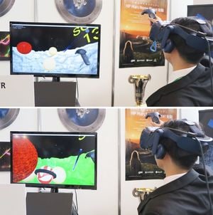 同社が展示したのは、「Yarinage MOON」。仮想現実技術で再現した「月面」で「やり投げ」を行い、時間内に標的バルーンを破裂させて得点を争う競技だ。
