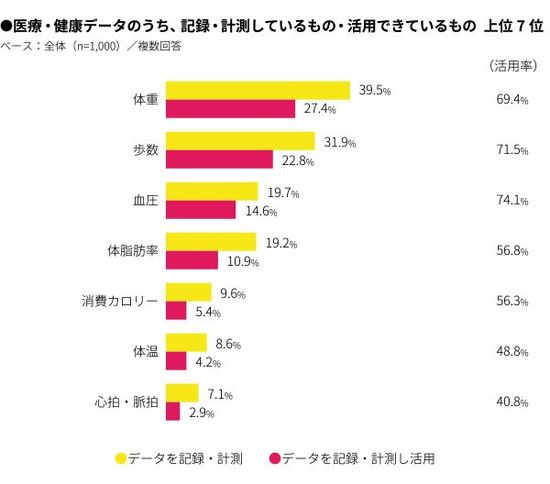生活者が記録・計測した人体に関するデータを医療サービス等と連携する「スマートヘルスケア」の取り組みについても、「体重」40%、「歩数」32%、「血圧」20%といったように、普段からデータを記録・計測している生活者は多く、「血圧」のデータについては記録者の74%が「活用」していることも判明した。