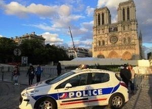 立ち入り禁止となっているノートルダム大聖堂前。パトカーが横づけされ、武装警官があたりを警備している。