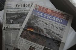 3月12日付け「ル・モンド」と「ル・フィガロ」紙。 サブタイトル「日本未曾有の地震、津波」に次いで 「大災害」の文字が衝撃的