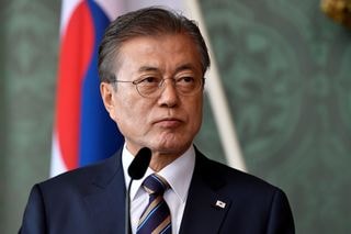 G20大阪サミットで文在寅大統領をぎこちなく歓迎した安倍晋三首相。8秒間の握手だけで、立ち話もなかった。(写真:代表撮影/ロイター/アフロ)