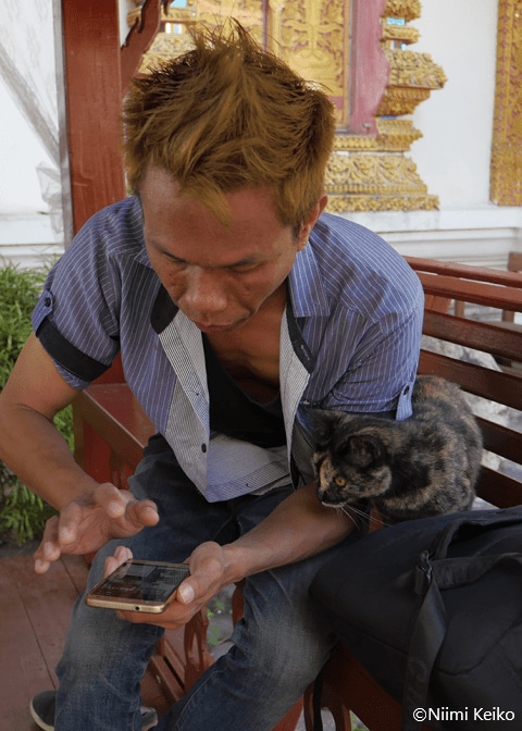旧市街の寺、ワット・チェンマンで、猫と遊びながらカメラを向けていたら、地元の青年が「どんな風に撮れたか見せて」と話しかけてきました。カメラの背面液晶モニターで再生画面を見せると、「ぼくも猫を撮っているんだ」と、スマホを操作し始めました。