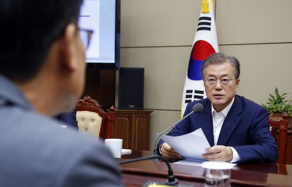7月15日、青瓦台で開かれた首席秘書官・補佐官会議で、日本の輸出規制について協議する文在寅大統領(写真:YONHAP NEWS/アフロ)