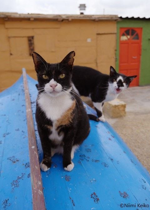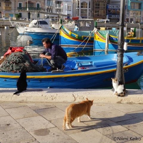 いつも魚をくれる漁師さんの船が港に帰ってくると、猫たちが寄ってきます。