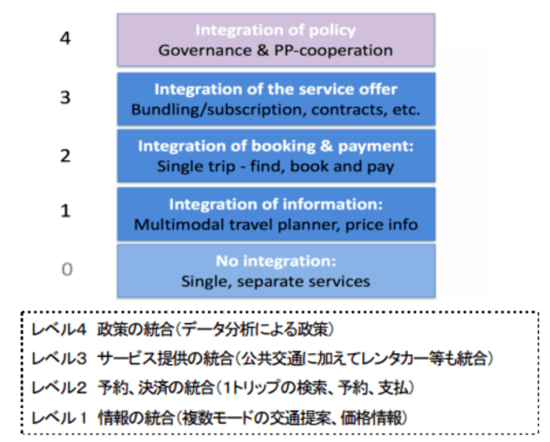 レベル0は「事業者が個別に交通サービスを提供する状態」、レベル1は「複数の交通手段の情報が統合された状態」、レベル2は「複数の交通手段を一本化し、予約・決済可能な状態」、レベル3は「一つのサービスとして結合され、定額制が加わった状態」、レベル4は「パッケージ化されたサービスが地域政策と結合している状態」だ。