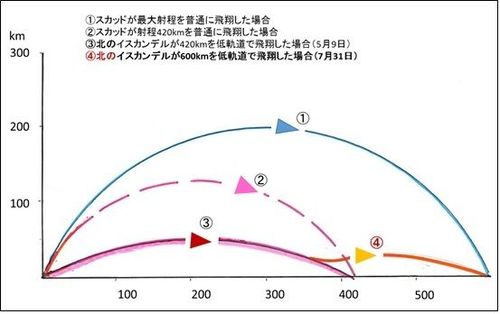 つまり、今回発射された北のイスカンデルの飛翔高度は、在来型の短距離弾道ミサイルスカッドよりも、約4分の1~3分の1の高度であり、低高度軌道(ディプレスド軌道)であったと言える。