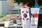 街中に「ボイコット・ジャパン」旗を掲げる中区職員(写真:YONHAP NEWS/アフロ)