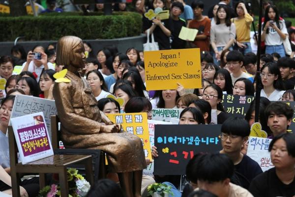 反日デモが激しさを増す韓国で、日本大使館前に据えられた少女像のところで日本への反発を強める韓国人(写真:AP/アフロ)