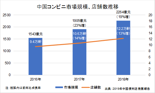 中国のフランチャイズ業界団体である中国連鎖経営協会(FFCA)と監査法人のKPMGが共同で発表した「2019年中国便利店発展報告」(「便利店」は「コンビニ」の中国語)によると、2018年における中国のコンビニ市場規模は前年比19%増の2264億元(約3.4兆円)。2018年12月末時点の店舗数は前年同期比13%増の約12.2万軒で、ともに2桁のプラス成長を遂げました。また、店舗当たり1日平均売上高は前年比7%増の約5300元(約7.9万円)でした。