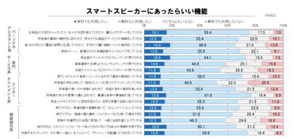 一方で、「スマートスピーカーにあったらいい機能」として、「自分の代わりに電話や訪問に応答してくれたり、子守や介護の補助・ペットの相手をしてくれる」機能や、「英会話やフィットネスなどのレッスンが受けられる」「日用品の不足をチェックしたり、日々の予定を教えてくれたり、暮らしのサポートをしてくれる」等、単に音楽やニュースを流す「製品」としての機能だけではなく、現在の生活をよりよくする「サービス」としての機能が求められていることがわかる。