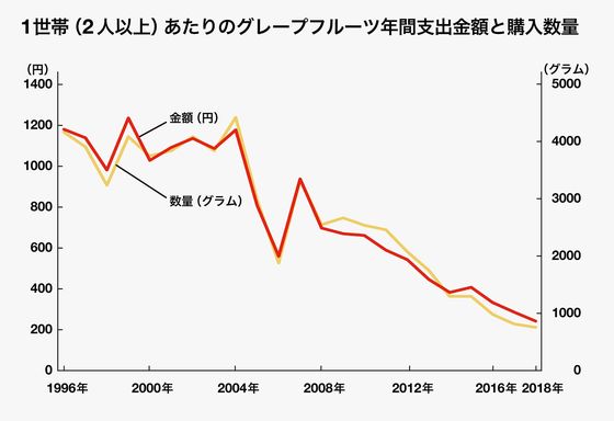 先日、グレープフルーツを食べたことのない若者が増えているという話題を耳にした。そこで、あらためて調べてみたところ、驚いた。総務省の家計調査によれば、2人以上の住む一世帯あたりの全国平均年間支出額のピークは1999年で1233円だったが、その10年後の2009年では668円に減少し、最新の2018年では240円と激減している。
