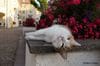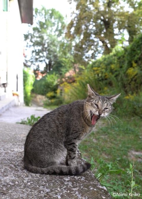 小径を歩いていくと、いつしか共同住宅の裏庭へと続く道に繋がっていました。そこにいた人に「いいよ、この道は通ってかまわないよ」と言われ、ゆっくりと進めば、待ちくたびれたような猫があくびをして出迎えてくれました。