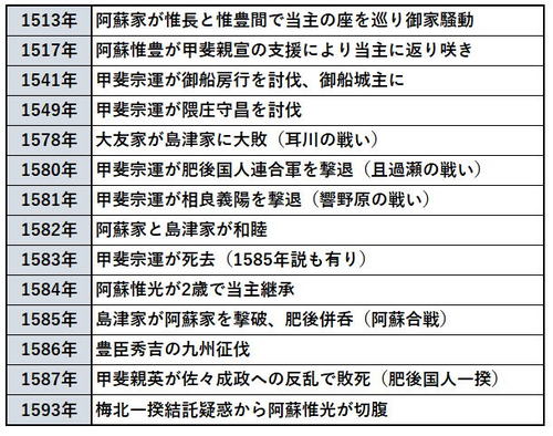 甲斐宗運こと本名、甲斐親直(かい・ちかなお)は、阿蘇家重臣の甲斐親宣(かい・ちかのぶ)の子として1508年(もしくは1515年という説も)に生まれます。父の親宣は、阿蘇家が兄・惟長(これなが)と弟・惟豊(これとよ)の間で当主の座を巡り御家騒動が起きた際、惟豊を支えて当主の座に就けた功によって阿蘇家家老となった人物でした。