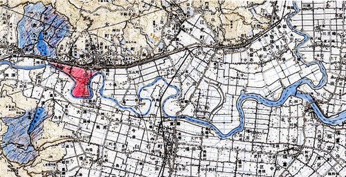 青い斜線で示したところが溜池に注ぐ領域、赤い斜線は氾濫地域。右が下流で有明海方向。