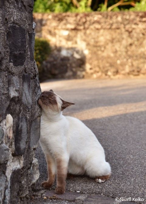 この猫は、石を積み上げた塀に顔をこすりつけて、注目してほしそうでした。