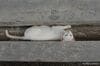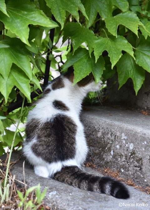 ほかにも人待ち顔の猫と出会えました。飼い主の帰宅を玄関先で待つうちに眠たくなってしまったのでしょうか。スヤスヤと寝ていたところ、人の気配を察して目を開けました。そしてまた、目をつぶって寝てしまいました。