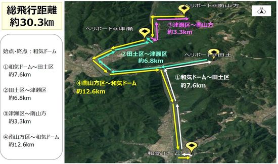 実証実験では和気町の津瀬区、田土区、南山方区に居住する65世帯、約150人を対象に商品を届ける。商品を搭載したドローンが、ドローンの発着地である「和気ドーム」を飛び立ち、すべての配送エリアを巡回して和気ドームに戻ってくる。所要時間は1時間15分程度、総飛行距離は約30.3キロメートル(図)。