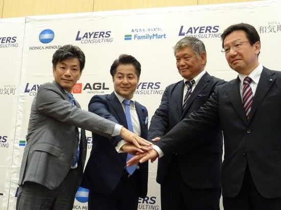 岡山県和気町の実証実験に参画する企業の担当者。左からエアロジーラボの谷紳一社長、レイヤーズ・コンサルティングの草加好弘事業戦略事業部統括マネージングディレクター、ファミリーマートの青木実執行役員、コニカミノルタの柴谷一弘産業光学システム事業本部グループリーダー