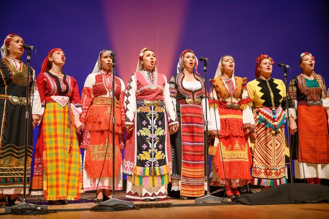 色とりどりの民族衣裳に身を包んだ合唱団。指揮はカティヤ・パルロヴァ。<撮影:石田昌隆>
