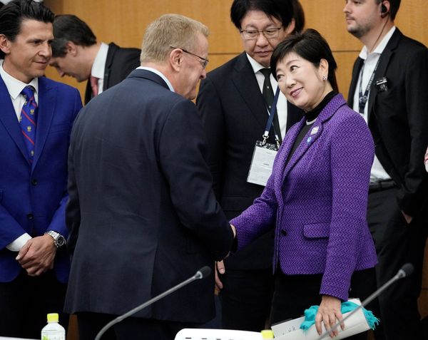 11月1日、4者会談に先立ち、IOCのジョン・コーツ調整委員長と言葉を交わす小池百合子都知事(写真:代表撮影/ロイター/アフロ)