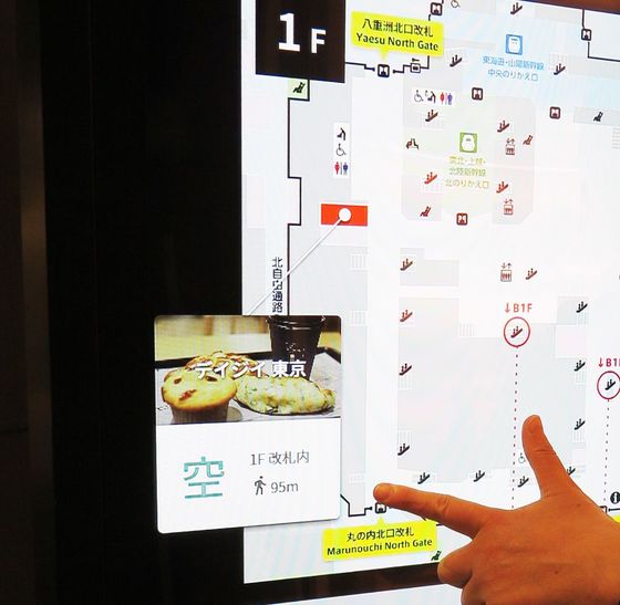 電子看板の設置場所のひとつ「銀の鈴」広場では、ディスプレイの前に駅利用客が立ち、駅構内の地図を見ている。地図内には、サービス対象店舗が赤く示され、「デイジイ東京 空」「ブルディガラ エクスプレス 混雑」といった表示がされている。すこし時間が経つと「混雑」が「残席わずか」になるなど、刻一刻と表示が切り替わっていく。