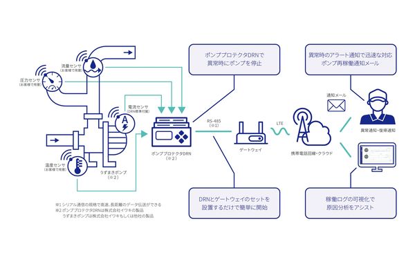 2年ほど前から、計測制御機器メーカー出身のベンチャー企業であるアムニモと協業し、自社製品の「ポンププロテクタDRN」(ポンプと周辺設備の異常運転による空運転、キャビテーション発生、オーバーフローなどを監視する装置)をIoT化すべく、渦巻きポンプを遠隔監視するビジネスの企画検討に着手。渦巻きポンプの遠隔監視サービス「pump guard(ポンプガード)」の名称でこのほど本格的にアムニモからサービス提供を開始した。