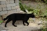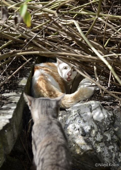 側溝の先にある秘密の場所へ帰ろうとしているところでしょうか。「ついて来るなよ!」と、大きな声で威嚇し、膨らませたシッポを激しく振っていました。