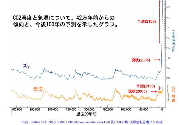 アル・ゴアが2006年の書籍と映画『不都合な真実』で「CO2が地球を暖める」証拠に使った「CO2濃度と温度の関係」を示すグラフがある。過去42万年に及ぶ南極の氷床コア分析から推定されたCO2濃度と気温の関係を示している(下の図)。