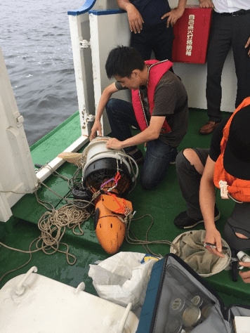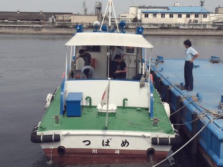 本調査は、収集機を水中に沈めて、濾し取る方式のため、岸壁や橋上からの調査が可能です。河川調査、岸壁からの海洋調査には、特別な許可や申請は必要がないことを確認の上、順次実施していきました。海上調査に当たっては、川崎市港湾局に協力いただき、港湾局所有の巡視船(写真2)の船上から採取を行いました。