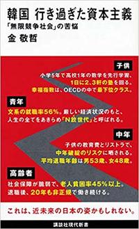 『韓国 行き過ぎた資本主義』というタイトルの新書(金敬哲著、講談社現代新書、11月20日発行)が抜群に面白い。韓国は子供、青年、中年、高齢者と「無限競争社会」に陥っており、そのことが韓国経済を疲弊させ、ダウンさせていると、客観的データや実例から論証している。著者は、ソウル在住の韓国人ジャーナリストだ。