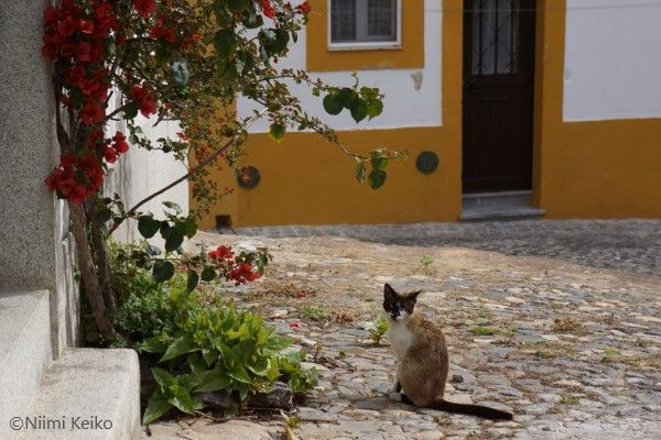 街角で友だちと待ち合わせをしているような雰囲気です。「ブーゲンビリアの家の角ね」なんて、約束したのかな? 友だちが早く来るといいね。