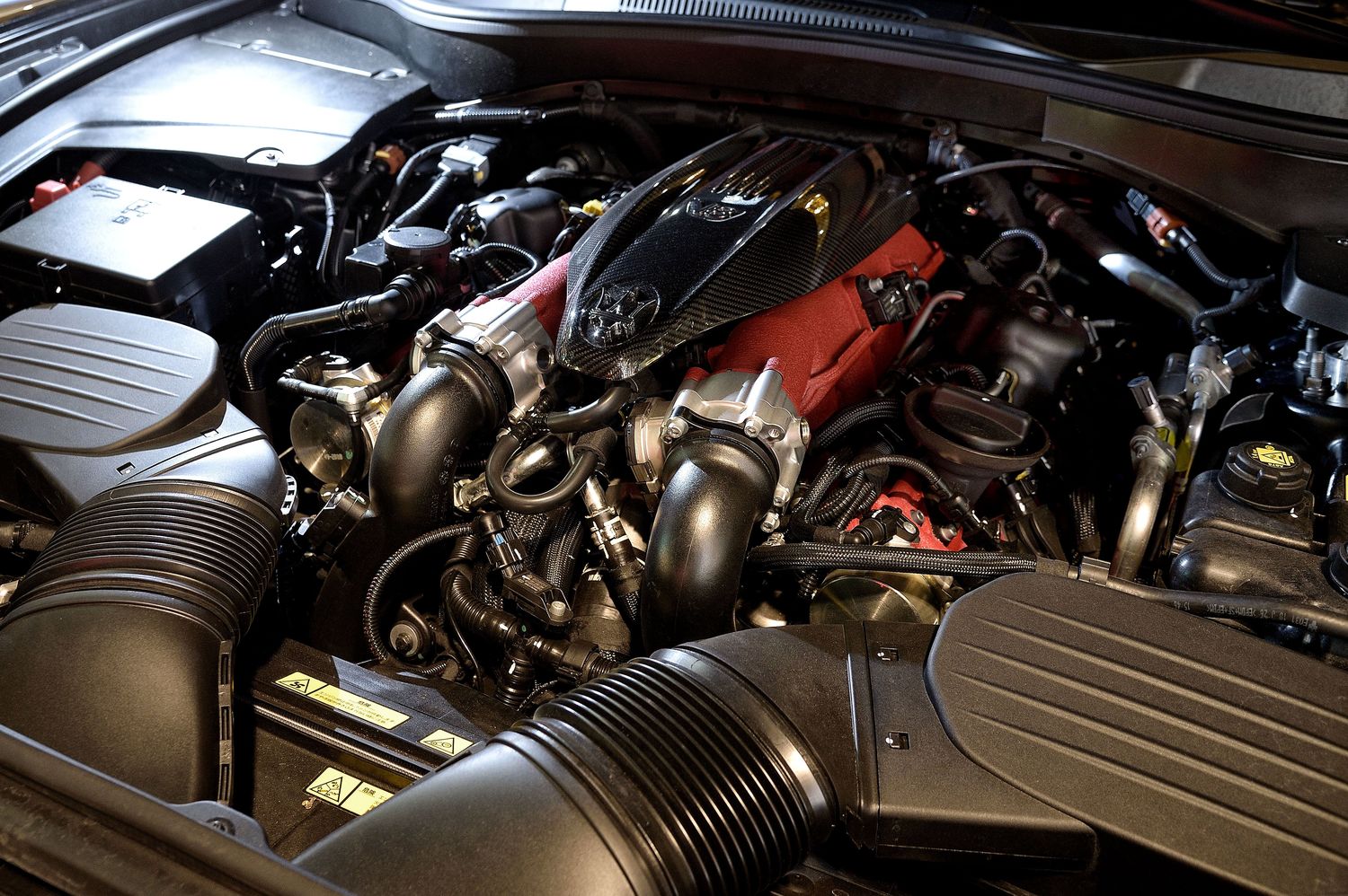 フェラーリがマセラティのために製造している3799ccV8ツインターボ。最高出力590ps/6250rpm、最大トルク734Nm/2500rpmを発揮する。