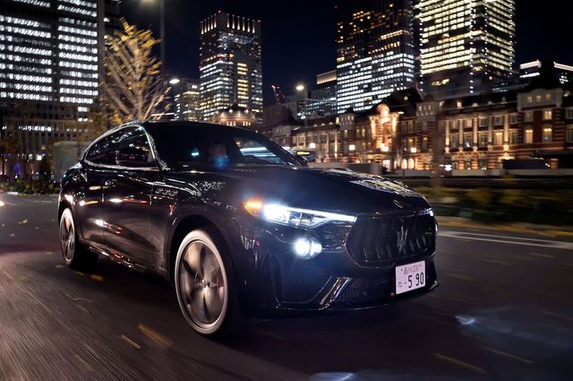 東京駅前を走るレヴァンテ トロフェオの2019年モデル。レース由来のテクノロジーによって、全長5020×全幅1985×全高1790mm、車重2340kgの巨体がコンパクト・カーのように俊敏に反応する。