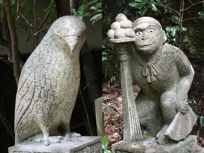 大豊神社境内には狛ねずみに以外にも、火難除の愛宕社の狛鳶や、災難除の日吉社の狛猿もあります。どちらも非常に珍しいものなので、ぜひチェックしてください。撮影/みかめ ゆきよみ