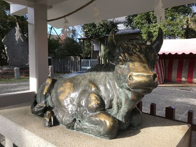 各地にある天神社・天満宮には必ず牛の像があります。菅原道真が丑年生まれであること、丑の日に亡くなったこと、遺体を葬送中に牛車が動かなくなり、その場を墓所に定めたことなどから、牛と道真には深い縁があるといわれています。