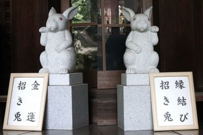 岡崎神社はとにかくうさぎだらけ! 狛うさぎだけでなく、本殿には世にも珍しい「招きうさぎ」がいます。絵馬やお守りや土鈴おみくじもうさぎ尽くしです。撮影/みかめ ゆきよみ