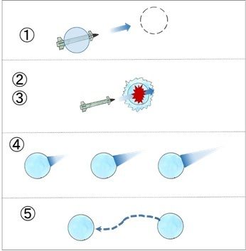 ②明るい閃光が、瞬間、丸く広がる。ミサイルが何かと衝突したことを示す。