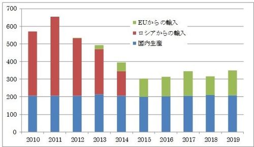 すなわち、EU市場で調達された天然ガスを、パイプラインを逆方向に利用し、所謂「リバース輸入」体制で購入しているのである。リバース輸入の輸送力は増強されており年250億m3に達している。