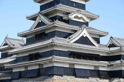 写真1:松本城(長野県)天守。千鳥破風と唐破風を上手にレイアウトして、デザイン上のバランスをとっている。撮影/西股 総生
