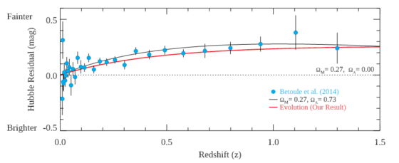けれども今回の発表によると、超新星の明るさが時代によって変化する効果(赤いカーブ)でも、水平線からのずれを説明できるというのです。