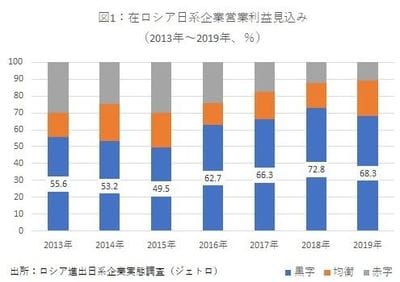 クリミア併合に端を発する米国・EUなどによる経済制裁とロシアによるその対抗措置、また原油価格の大幅下落などから大きく経済が落ち込んだ2015年を底に、2016年以降、営業黒字を見込む割合は常に6割を超えている(図1)。