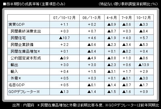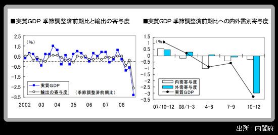 内外需別の寄与度は、内需が▲0.3ポイント、外需が▲3.0ポイント。米住宅バブル崩壊と、いわゆる「リーマン・ショック」を含む金融不安の異様な強まりを背景に、米国で家計の過剰消費構造が崩壊したことで、輸出依存度の高い日本経済は、「フリーフォール」に近い状態に陥った。