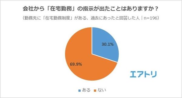 続いて、「今までに会社から在宅勤務の指示が出た経験があるか」と質問したところ、30.1%の人が「ある」と回答。一方、「ない」は69.9%という結果だった。