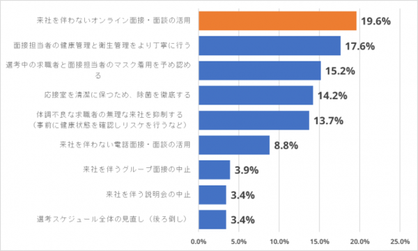 また、「どのような対策を検討・実行しているか」を調査すると、「来社を伴わないオンライン面接・面談の活用」が19.6%で最多となった。次いで、「面接担当者の健康管理と衛生管理をより丁寧に行う」が17.6%、「選考中の求職者と面接担当者のマスク着用を予め認める」が15.2%と続いた。外出や直接対面する必要がないWebを活用した採用方法が有効と考えられているようだ。