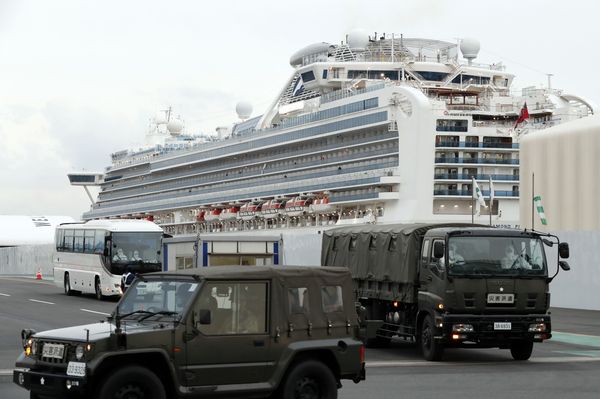 大型クルーズ船「ダイヤモンド・プリンセス」から下船した乗客を乗せたバスと自衛隊車両(2020年2月20日、写真:AP/アフロ)