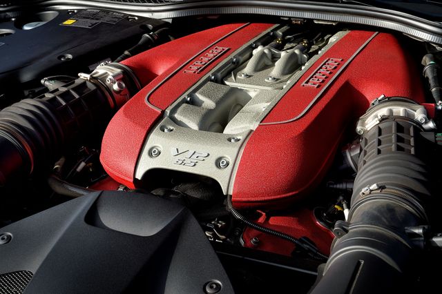 フェラーリ史上最強のV12エンジンは、同じく赤い結晶塗装が施されたインテークマニフォールドの下に潜む。